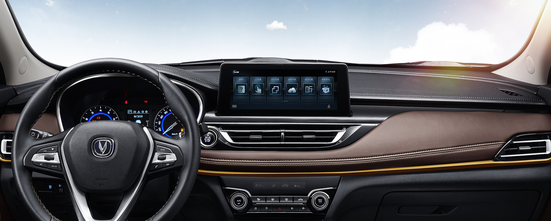 走進(jìn)車(chē)內(nèi),新車(chē)依舊與現(xiàn)款車(chē)型一致,簡(jiǎn)約而時(shí)尚。配備了三幅式多功能方向盤(pán)、懸浮式中控屏,給車(chē)內(nèi)增添了科技感。中控臺(tái)采用了皮革進(jìn)行包裹,貫穿整個(gè)中控臺(tái)的金色飾條看起來(lái)很時(shí)尚。